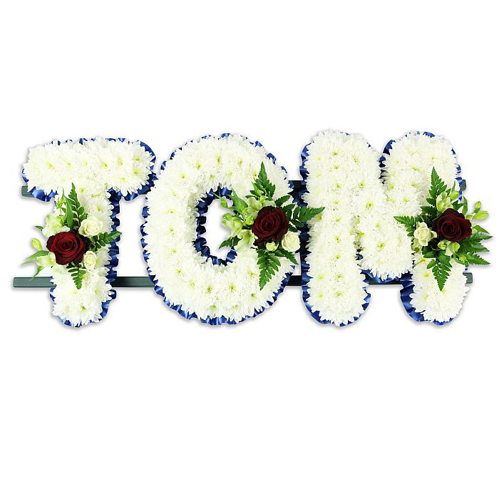 Honor a loved one with the elegant Custom Tom Tribute from Beddington Florist. This handcrafted funeral letter tribute features a base of pristine white chrysanthemums, accented with premium red roses and delicate white freesias for a timeless and heartfelt display. Designed to spell out "TOM", it offers a personal and dignified way to say goodbye and express your deepest condolences. Our skilled florists in Beddington carefully arrange each letter to ensure balance, beauty and lasting freshness. Approximate dimensions: length 90cm (35"), width 33cm (13"), height 20cm (8"). Roses are delivered with natural guard petals to protect the inner blooms during transit; simply remove these outer petals on arrival for the perfect finish. Due to seasonal availability, some flowers may be substituted with blooms of similar colour, size and value, maintaining the same premium style and quality. Ideal for funerals, memorials and celebration-of-life services, this custom tribute offers a graceful focal point for family and friends. Order online from Beddington Florist for reliable, professional service and fresh, premium flowers arranged with care.